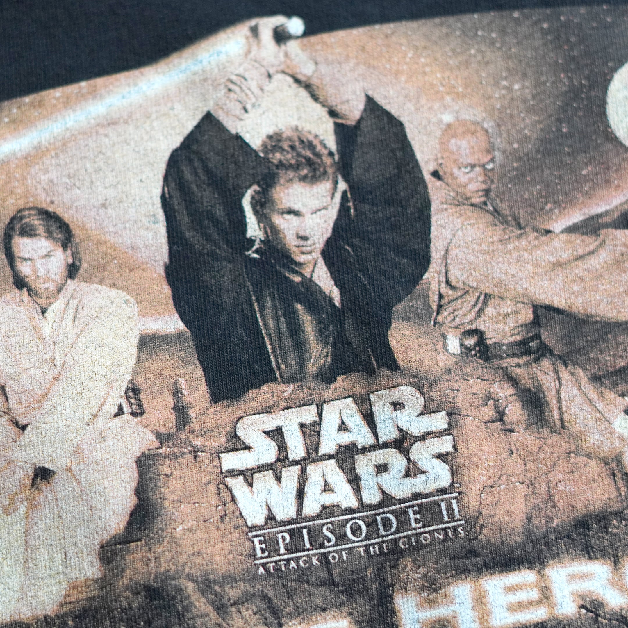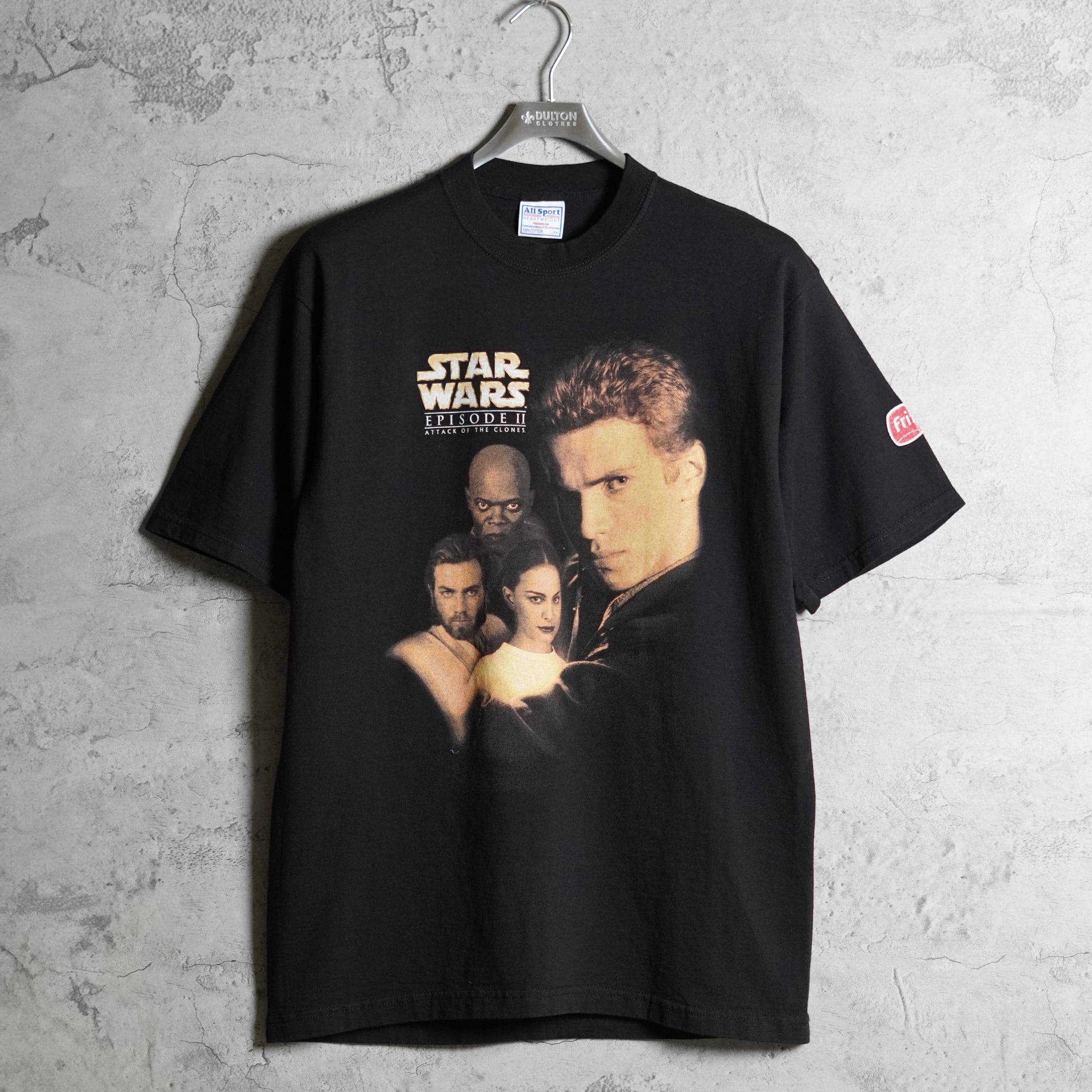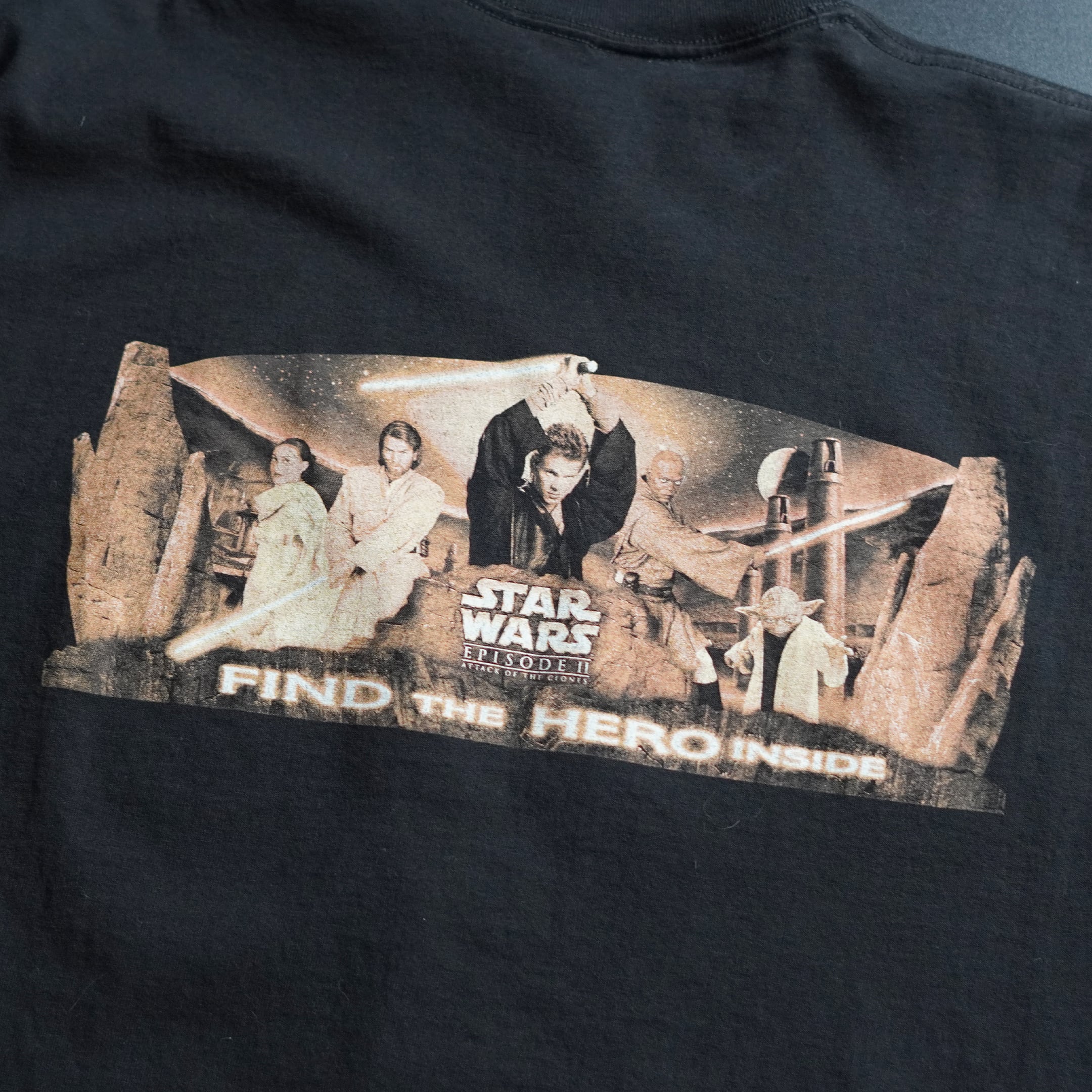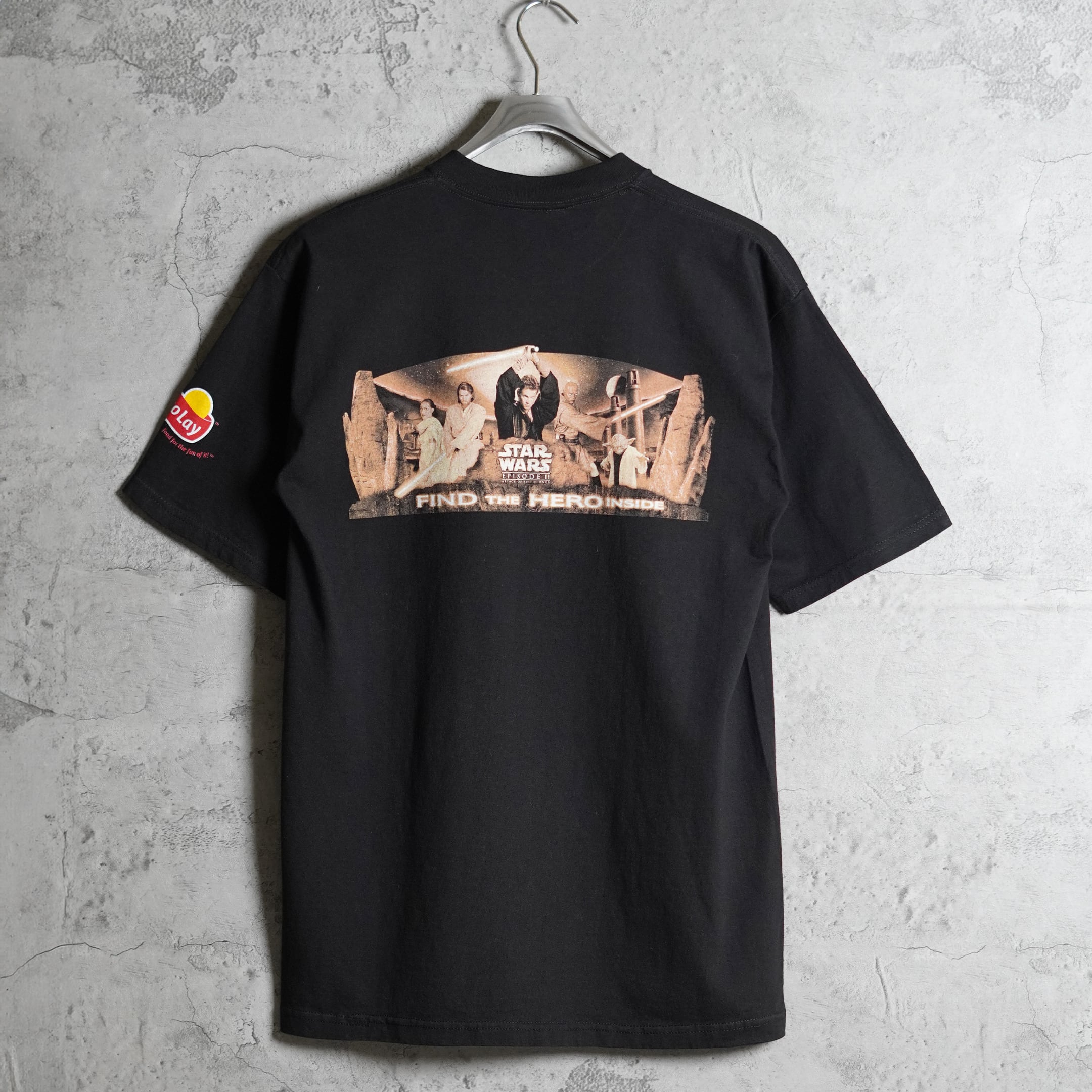 2002年公開「スターウォーズエピソード2クローンの攻撃」。フロントにはアナキン、パドメ、オビワンそしてメイスが、バックにはライトセーバーを構える姿がプリントされています。こちらはポテトチップスなどで有名なFritolayのプロモとして製作されており、袖にロゴが入ります。