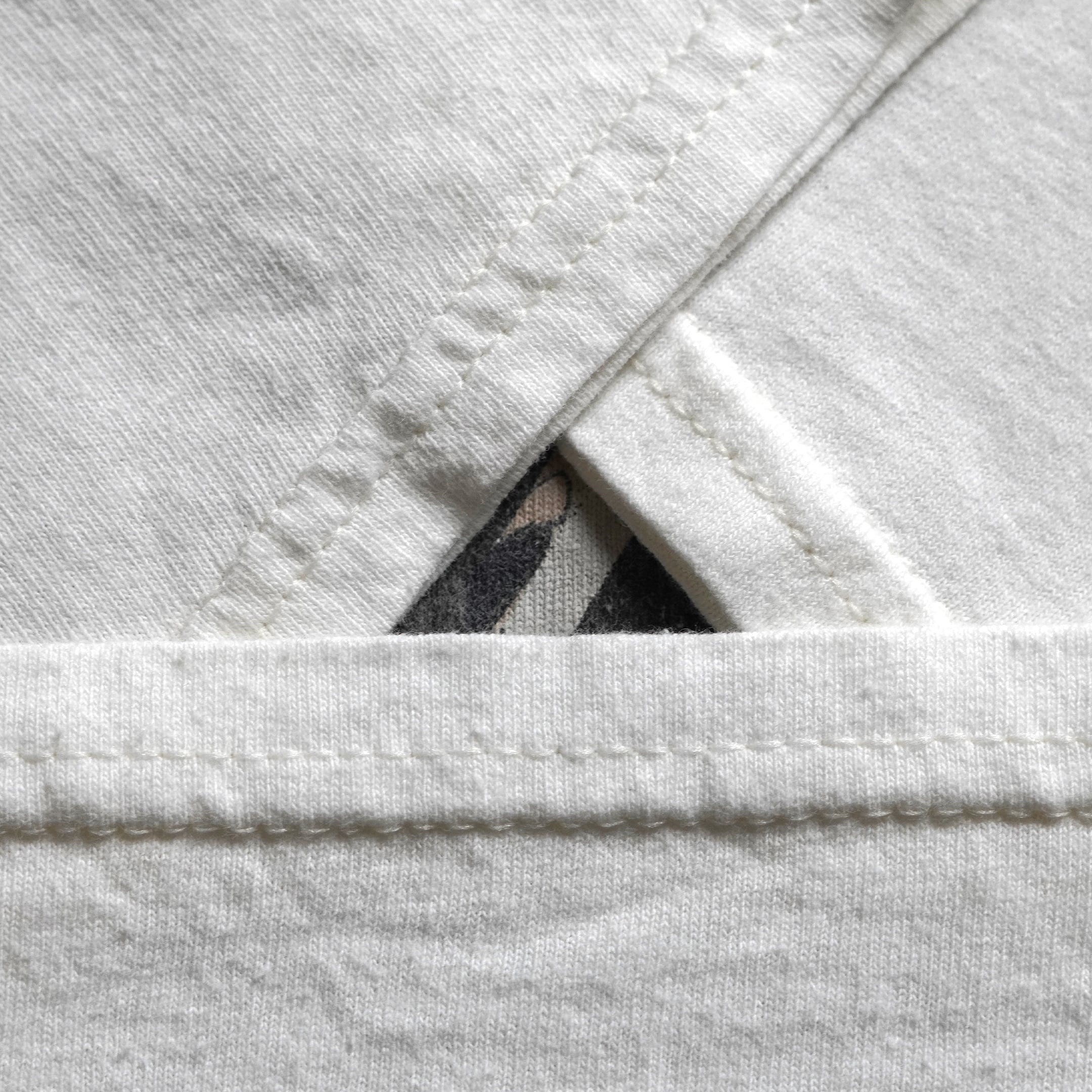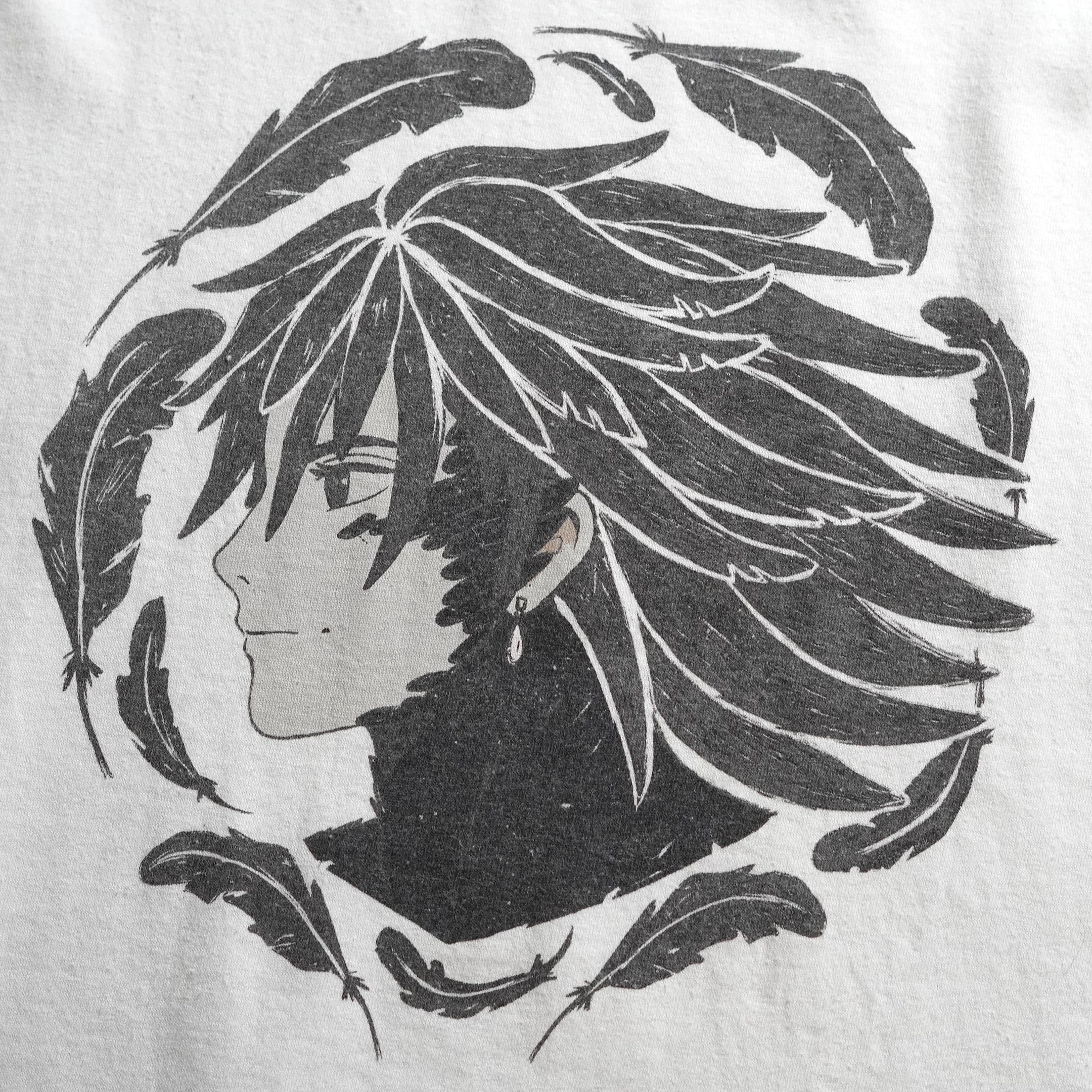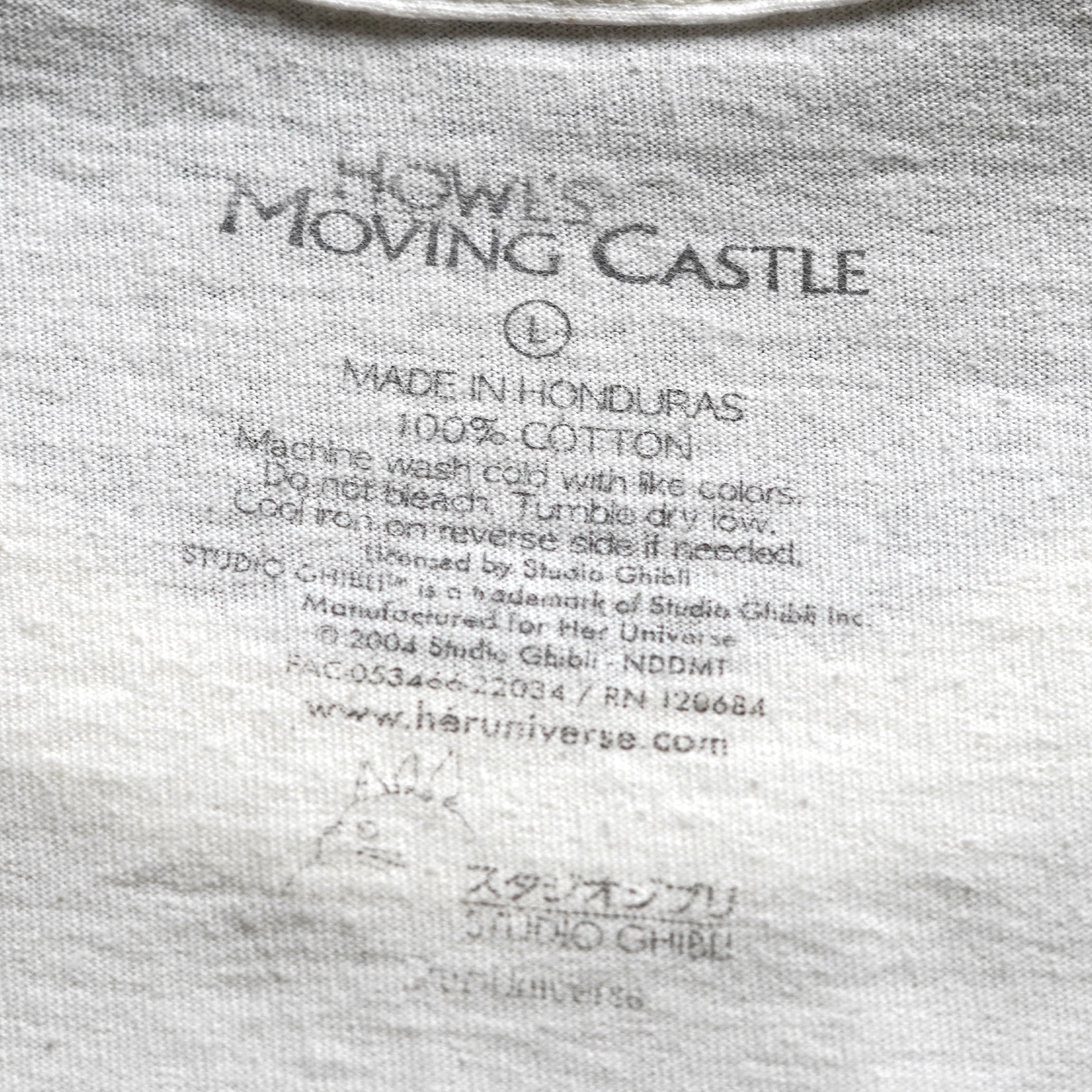 2004年公開「ハウルの動く城」。販売当時は日本未発売の海外公式ライセンス品です。フロントにはハウルの横顔モチーフとなったアートワークがプリントされています。近年物のため、プリントタグが採用されています。プリントタグ物の中でもジブリ関連品は「ネクストビンテージ枠」としてコレクター人気の高い1枚です。