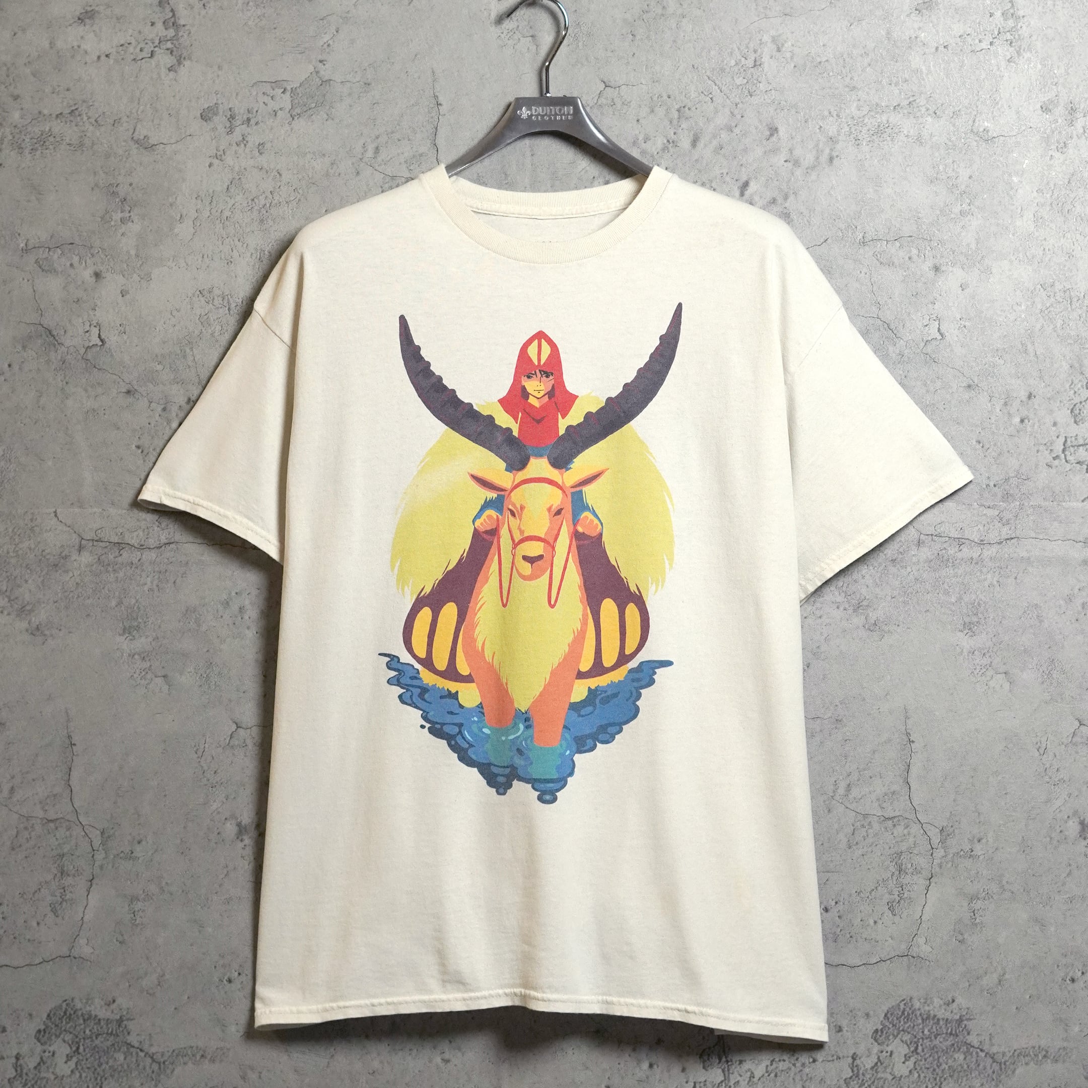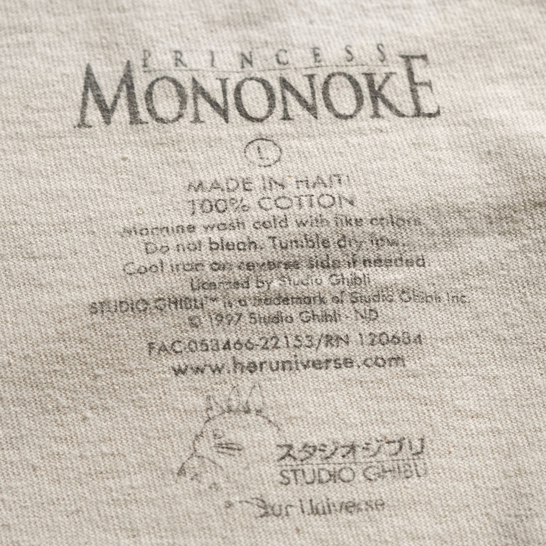 1997年公開「もののけ姫」。販売当時は日本未発売の海外公式ライセンス品です。フロントには明日かモチーフのアートワークが大きくプリントされています。近年のもののため、プリントタグが採用されています。プリントタグ物の中でもジブリ関連品は「ネクストビンテージ枠」としてコレクター人気の高い1枚です。