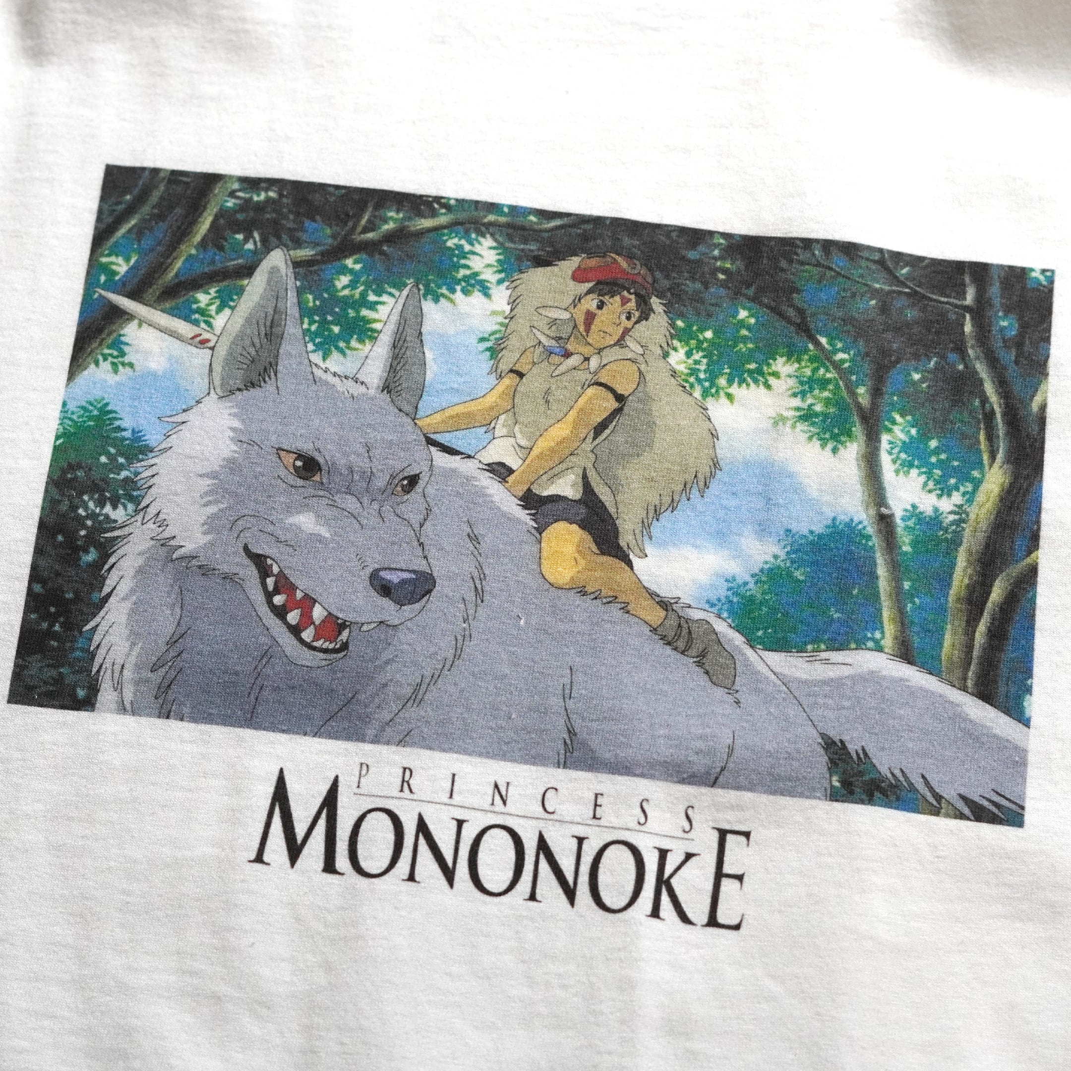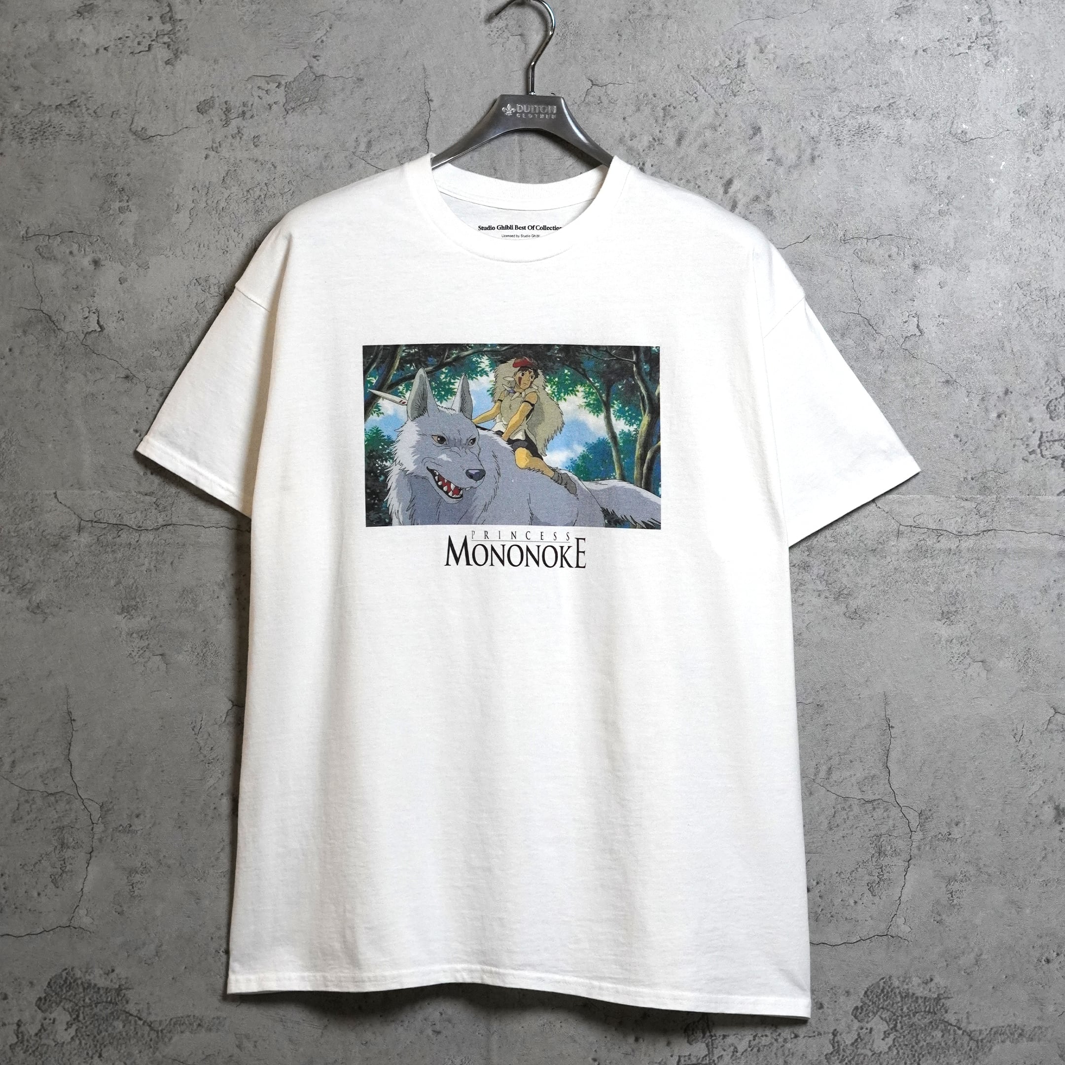 1997年公開「もののけ姫」。販売時は日本未発売の海外公式ライセンス品です。フロントには劇中のワンシーンとタイトルがプリントされています。ジブリにおいてシーンがプリントされるTシャツはこれまで数が少なく、本企画のものが出たときはコレクター間で話題になりました。近年物のため、プリントタグが採用されています。プリントタグ物の中でも「ネクストビンテージ枠」としてコレクターから認知されております。今のうちに抑えて置いておきたい1枚です。