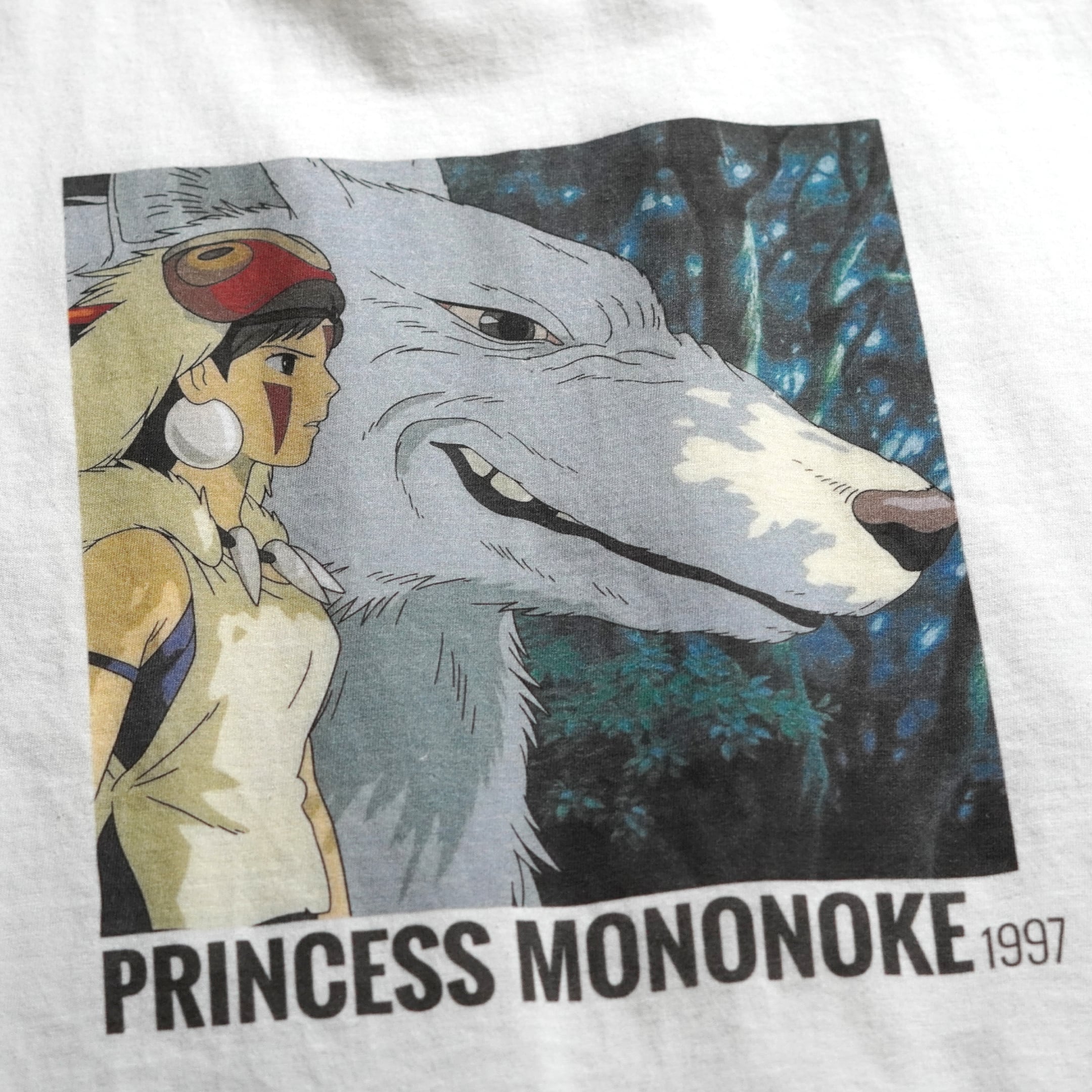 1997年公開「もののけ姫」。販売時は日本未発売の海外公式ライセンス品です。フロントには劇中のワンシーンとタイトルがプリントされています。ジブリにおいてシーンがプリントされるTシャツはこれまで数が少なく、本企画のものが出たときはコレクター間で話題になりました。近年物のため、プリントタグが採用されています。プリントタグ物の中でも「ネクストビンテージ枠」としてコレクターから認知されております。今のうちに抑えて置いておきたい1枚です。