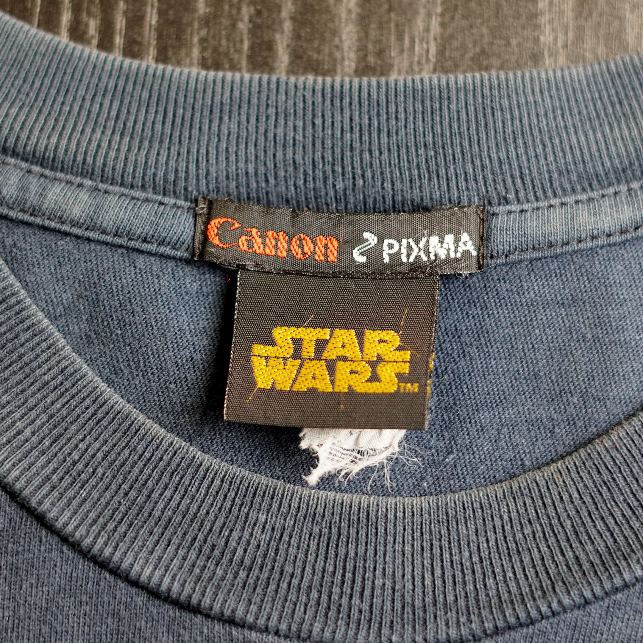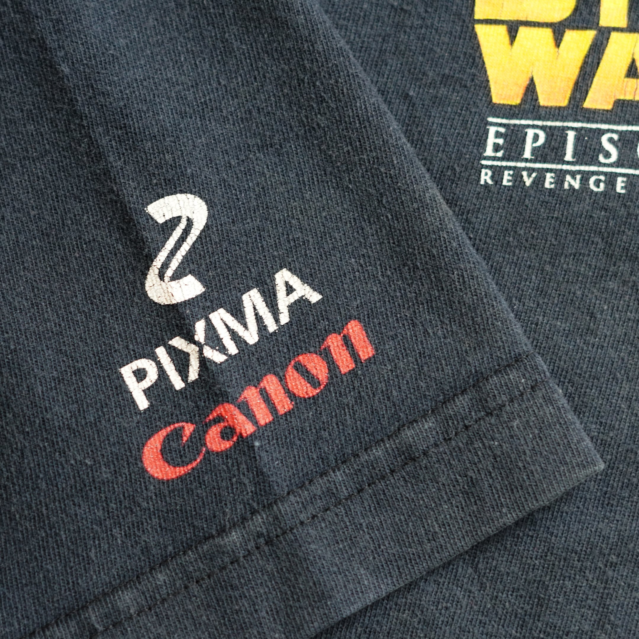 2005年公開「スター・ウォーズ エピソード3/シスの復讐」。Canonのプリンター「PIXMA」のプロモーションの1枚。スターウォーズタグと合わせて、CANON PIXMA付く個体で珍しい仕様です。フロントにはタイトルロゴの胸プリ、バックにはダースベイダーのアートワークが大きくプリントされています。
