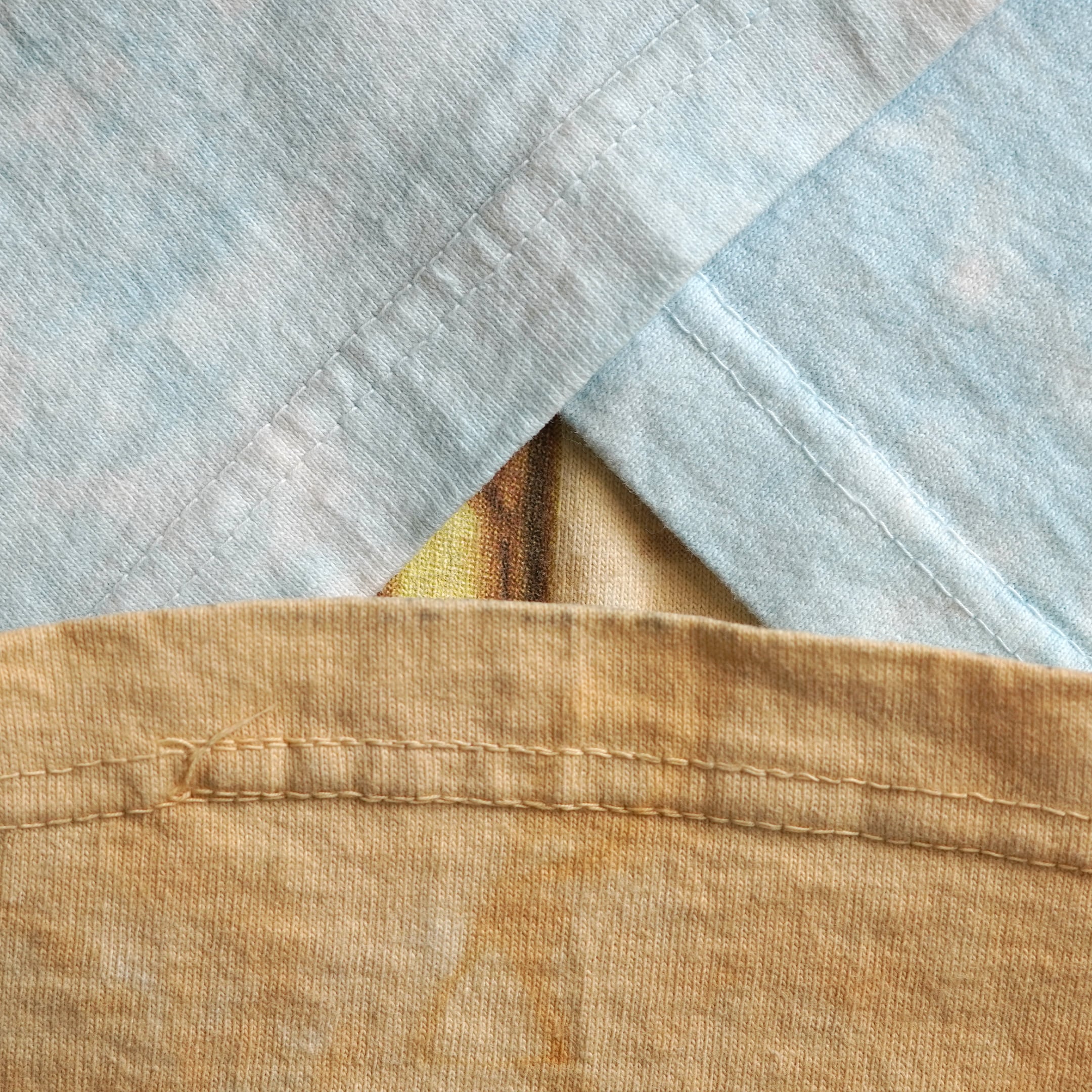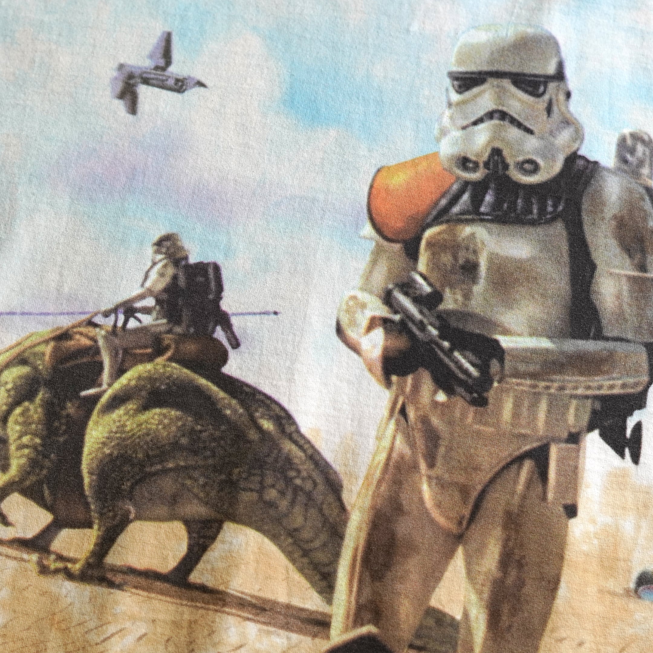 1977-83年に公開された「スター・ウォーズ 旧三部作(エピソード4〜6)」。「Liquid Blue」製作の1枚。タイダイプリントといえばこのブランドを想像する方も多いのではないでしょうか?タイダイに加えて両面AOP(全面プリント)という手の込み具合からポスターやアート作品としても評価の高いシリーズです。胸のロゴに記載のある「THE MAGIC OF MYTH」は1997年からスミソニアン宇宙航空博物館にて開催された展覧会の名称です。こちらの展覧会名のプリントがないものもありますが、こちらはこの展覧会向けに同一の版を使用して製作されたものと思われます。