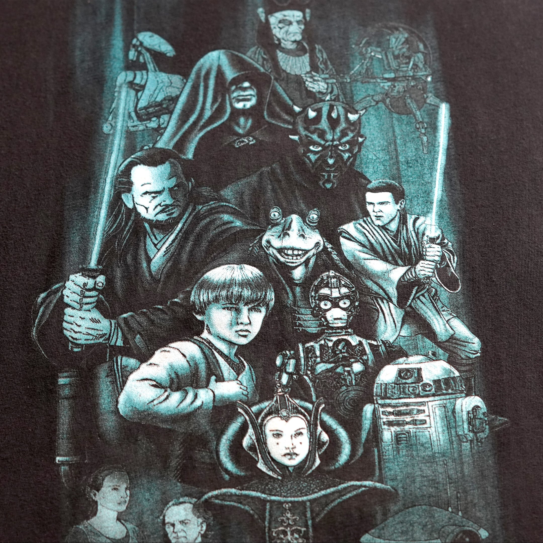 1999年公開「スター・ウォーズ エピソード1/ファントム・メナス」。作中登場するキャラクターが大きくプリントされています。スターウォーズタグ付き。