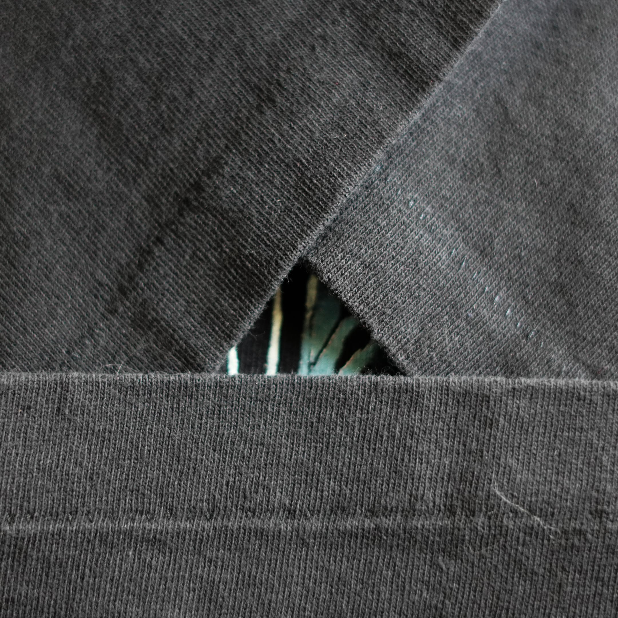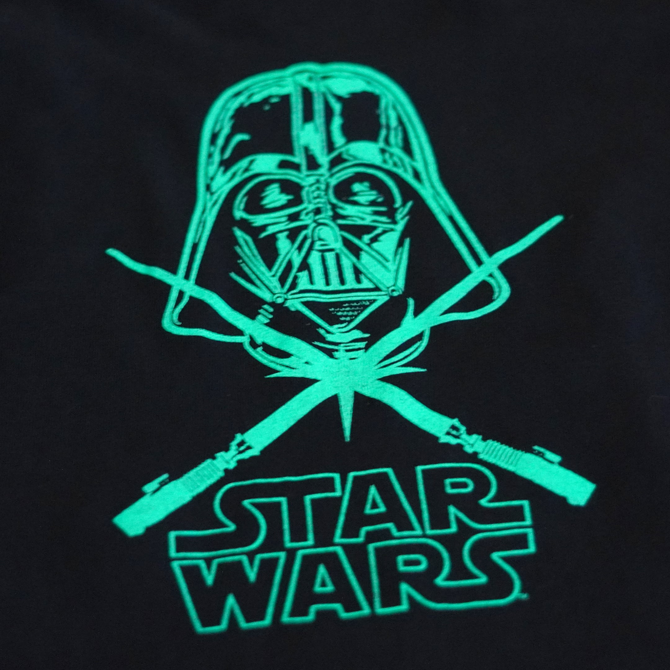 1977-83年に公開された「スター・ウォーズ 旧三部作(エピソード4〜6)」。フロントにはダースベイダーとシップが大きくプリントされています。バックにもダースベイダーをモチーフにしたロゴがプリントされていますが、こちらは蓄光プリントになっており、暗闇で光る仕様となっております。コピーライトあり。