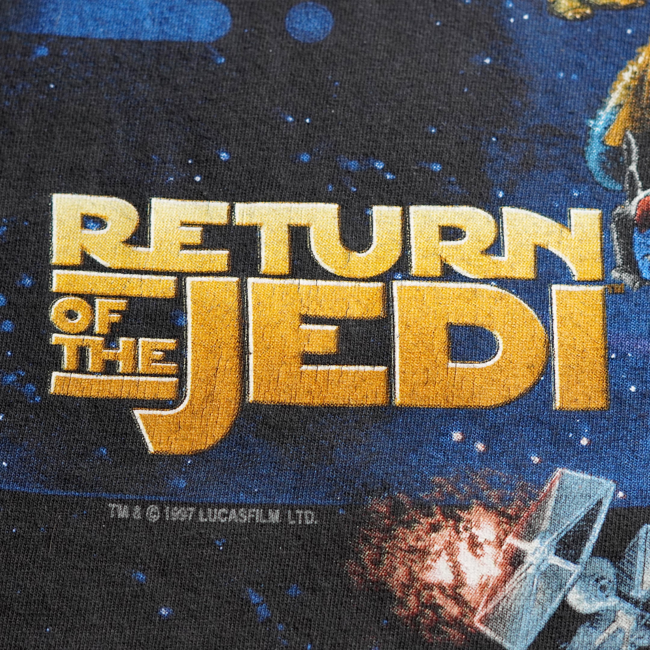 1997年公開「スター・ウォーズ トリロジー 特別編 」。特別編に採用されたポスターデザインがバックに、フロントにはタイトルロゴが胸にプリントされています。主要キャストが大きく映るこちらはポスターとしても評価が高く、探されている方も多い1枚かと思います。コピーライトあり。