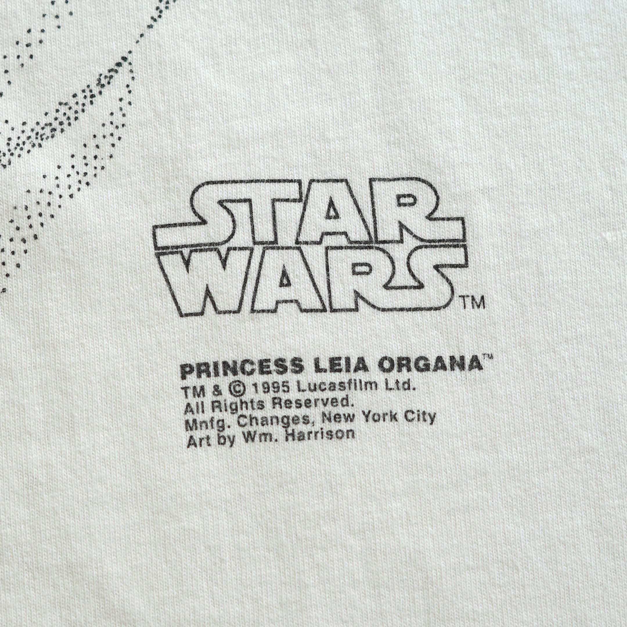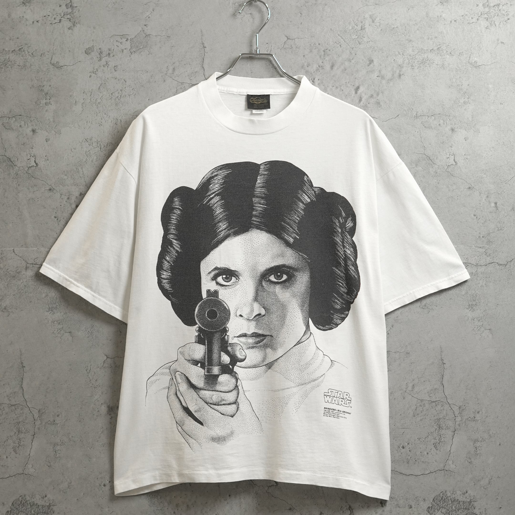 1977-83年に公開された「スター・ウォーズ 旧三部作(エピソード4〜6)」。こちらはChangesの企画で全7枚作られたものの1つです。デザイナー「Willium Harrison」氏によってデザインされました。Changes独自の企画だったため、他社でのデザインの流用が見られず市場流通量が極めて少ないです。特に全種揃えると、コレクター間でも一目置かれるレベルです。フロントにはレイアのビッグフェイスがプリントされています。