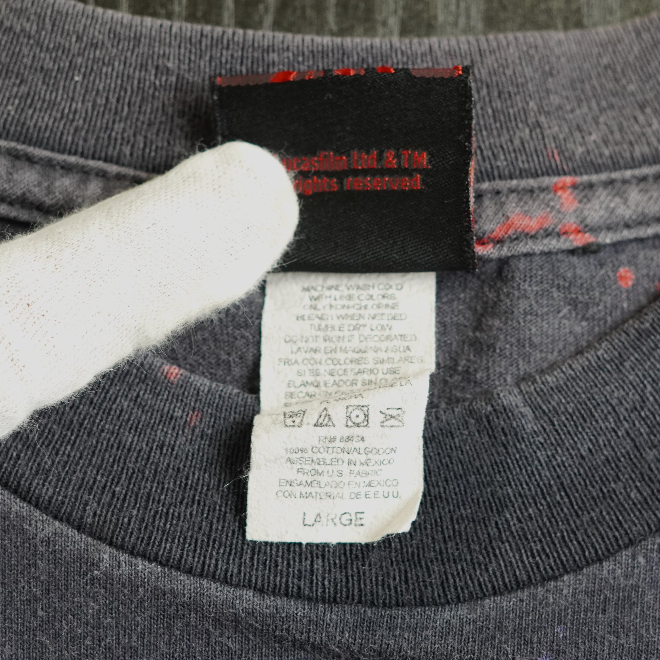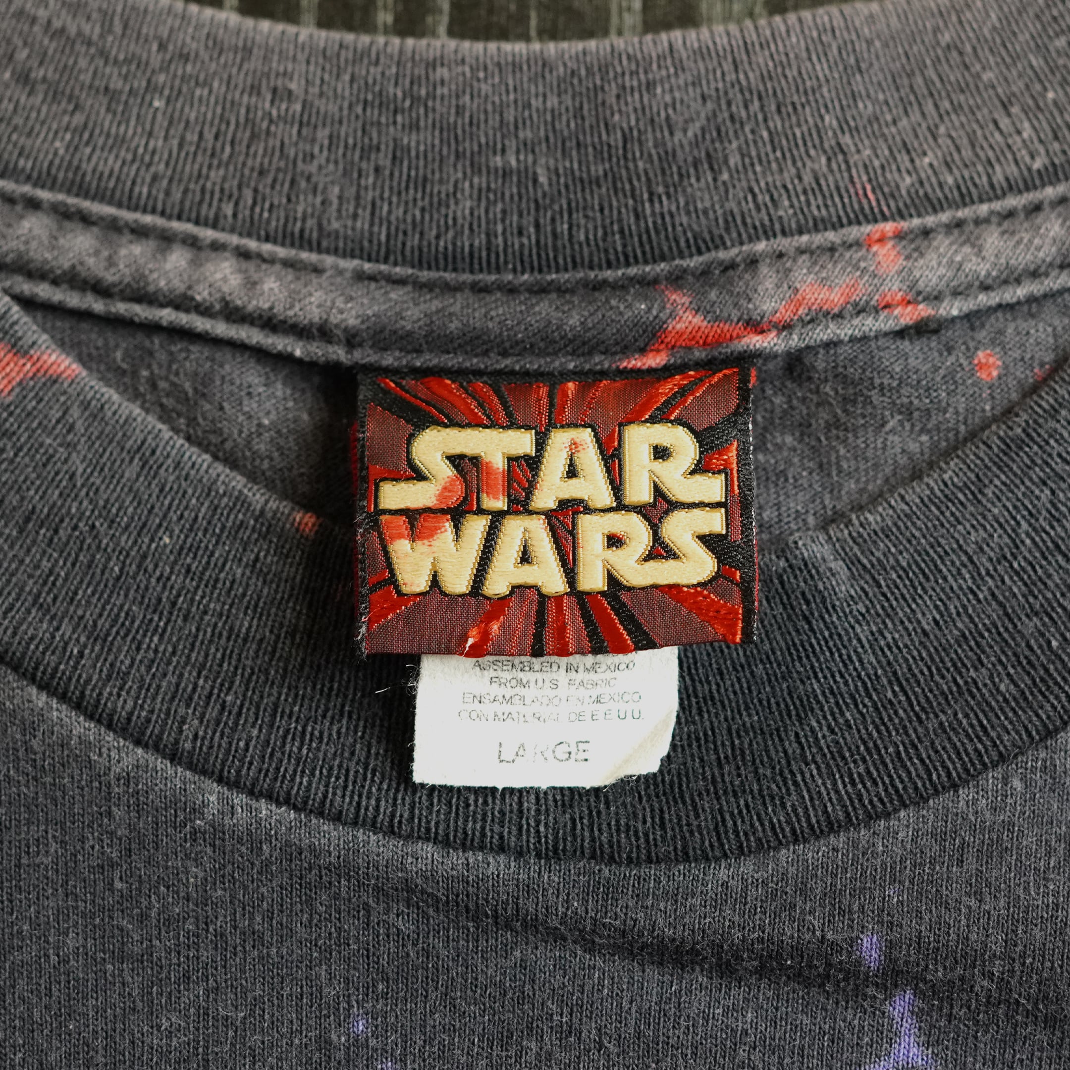 1999年公開「スター・ウォーズ エピソード1/ファントム・メナス」。ダースモールが全面にAOPで表現されている一枚。ボディ製作後プリントを行ったためタグにもプリントが乗っています。生産工程を考えることのできる面白い1枚です。