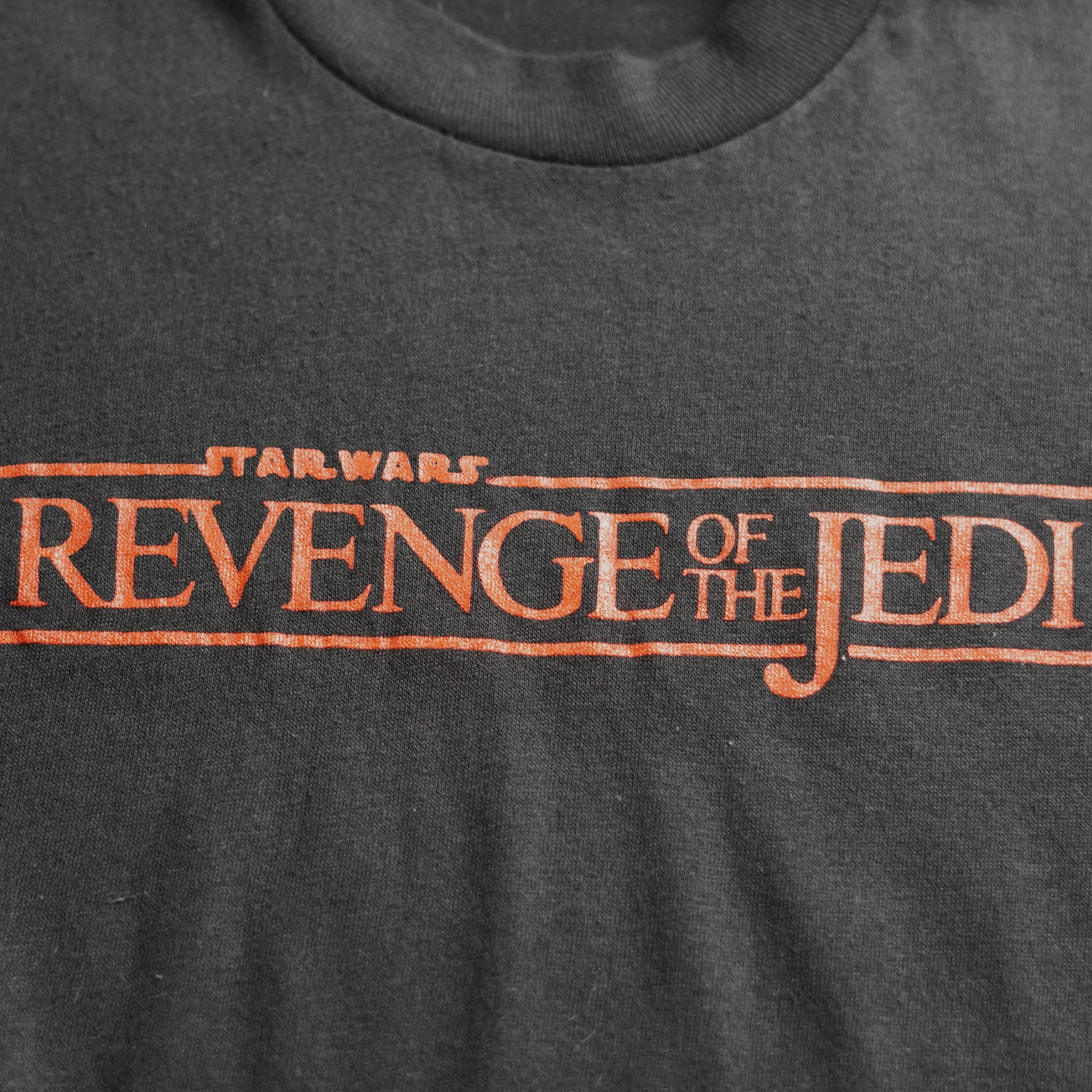 1980年公開「スター・ウォーズ エピソード6/ジェダイの帰還」。正式採用されたタイトル「Return of the Jedi」ではなく、企画段階まで採用されたタイトル「Revenge of the Jedi」のロゴがプリントされた1枚です。タイトル変更が映画公開の4か月前だったこともあり、タイトル発表も「Revenge of the Jedi」で行われていました。その背景からこのタイトルが使用されたブート品、タイトル変更発表前に一部すでに製造されていたものが一部流出しました。当時の製造記録がほぼ残っておらず、公式品としてエビデンス付きで確認されているものはわずかです。そのような背景のため、ブート品、公式品の双方とも80年代のものは高く評価されています。本商品に関してもエビデンスは残っておらず当店ではブート品として販売いたします。
